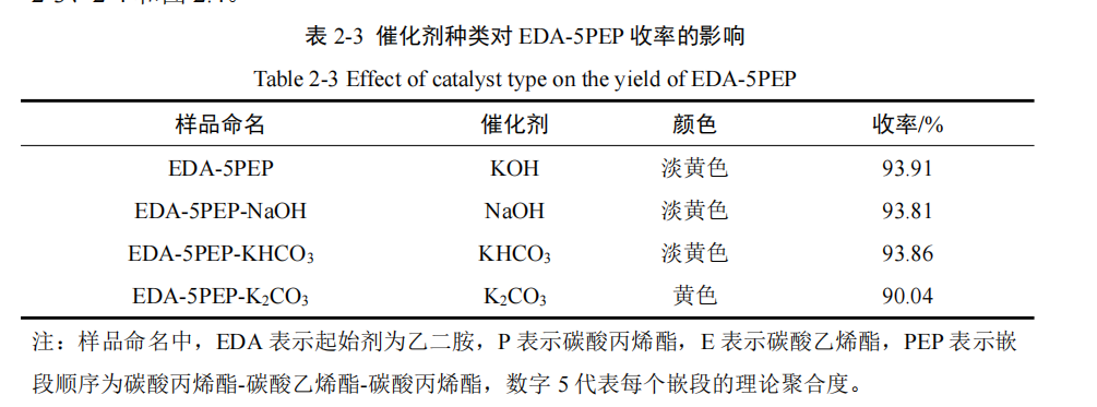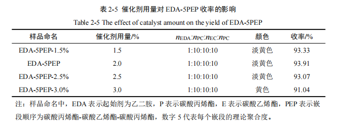 文献报道[101]指出,环状碳酸酯的开环聚合反应受催化剂种类及用量、反应温度及 反应时间的影响。当温度 130℃、嵌段反应时间 2 h、催化剂用量为起始剂和第一嵌段 碳酸丙烯酯总摩尔的 2.0%,环状碳酸酯按照“碳酸丙烯酯-碳酸乙烯酯-碳酸丙烯酯”的 顺序投加,每次投加量为起始剂摩尔数的 10 倍,考察了催化剂种类对三嵌段、5 聚合 度的乙二胺基聚碳酸醚酯类破乳剂(EDA-5PEP)的收率和分子结构的影响,结果见表 2-3、2-4 和图 2.4。