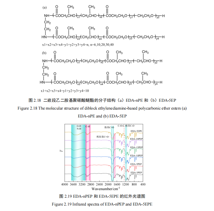 根据图 2.19 和表 2-14 可知,EDA-nPEP 聚碳酸醚酯类破乳剂分子具有相同的主要官能团,均含有碳酸酯基、酰胺基和醚基,碳酸酯基特征吸收峰的强度差别较小,但酰 胺基和醚基特征峰的强度随着聚合度增加逐渐减弱,这一变化规律与 EDA-nP 和 EDA-nPE 相同,这可能是由于碳酸酯基的共轭效应和氢键效应所致。图 2.19 和表 2-14 还显示,EDA-5EPE 和 EDA-5PEP 含有相同的红外特征峰,表明二者分子中含有相同的 主要官能团。因此,三嵌段乙二胺基聚碳酸醚酯类破乳剂的分子中主要官能团包括碳酸 酯基、醚基和酰胺基(图 2.20)