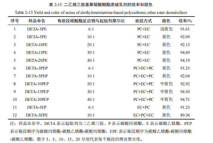 以二乙烯三胺为起始剂,通过控制环状碳酸酯的加入量和加入顺序,共合成 12 种 二乙烯三胺基聚碳酸醚酯类破乳剂,结果见表 2-15