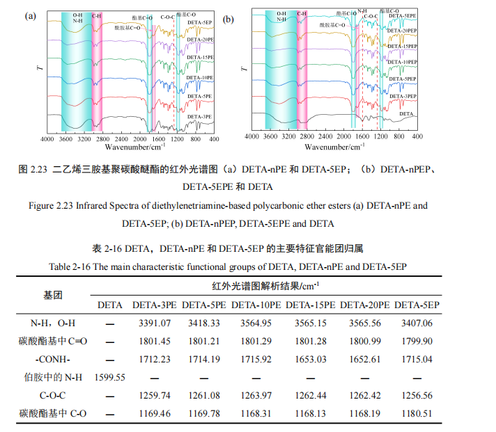 由表 2-15 可知,当嵌段数相同时,随着聚合度的增加,二乙烯三胺基聚碳酸醚酯 类破乳剂的收率呈增长趋势,但增幅较小。对于 DETA-nPE 系列二乙烯三胺基聚碳酸醚 酯类破乳剂,当聚合度为 15 时,DETA-15PE 的收率达到最大值,为 94.69%。对于 DETA-nPEP 系列二乙烯三胺基聚碳酸醚酯类破乳剂,当聚合度为 20 时,DETA-20PEP 的收率最高,为 94.71%。当聚合度相同时,通过比较不同嵌段顺序的二嵌段和三嵌段 二乙烯三胺基聚碳酸醚酯类破乳剂可知,以碳酸乙烯酯作为第一嵌段的破乳剂,其收率低于以碳酸丙烯酯作为第一嵌段的破乳剂。这一规律与乙二胺基聚碳酸醚酯类破乳剂的 规律一致。此外,当聚合度、嵌段数和嵌段顺序相同时,乙二胺基聚碳酸醚酯类破乳剂 的收率高于二乙烯三胺基聚碳酸醚酯类破乳剂的收率,但其颜色较浅。这表明,起始剂 链长对破乳剂的收率和颜色具有一定影响。 对表 2-15 中的二乙烯三胺基聚碳酸醚酯类破乳剂进行了红外光谱表征,并对比了 二乙烯三胺的红外光谱,相关结果见图 2.23 及表 2-16、2-17。
