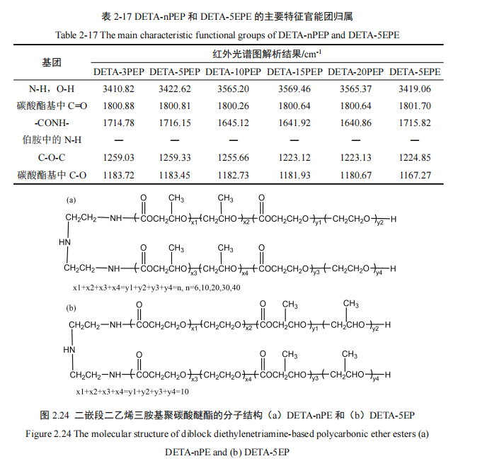 从图 2.23(b)和表 2-17 可知,DETA-nPEP 系列聚碳酸醚酯类破乳剂含有相同的 主要官能团,其规律与 EDA-nPEP 一致。DETA-5EPE 的红外光谱图中同样显示了碳酸 酯基的 C=O 和 C-O 伸缩振动峰、醚基的 C-O 伸缩振动峰和酰胺基的酰胺Ⅰ谱带,表明 DETA-5EPE 分子中的主要官能团与 DETA-nPEP 一致。由此可见,三嵌段二乙烯三胺基 聚碳酸醚酯类破乳剂分子中主要官能团包括碳酸酯基、醚基和酰胺基(图 2.25)。 通过对比相同嵌段方式但不同聚合度的二嵌段和三嵌段二乙烯三胺基聚碳酸醚酯 类破乳剂的红外光谱图发现,随着聚合度的增加,酰胺基和醚基的特征吸收峰强度逐渐减弱,此规律与乙二胺基聚碳酸醚酯类破乳剂红外光谱图的变化规律一致。