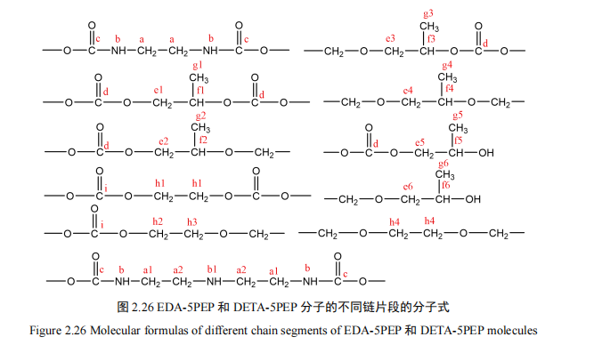 由于系列二乙烯三胺基聚碳酸醚酯类破乳剂的分子结构相似,选取 DETA-5PEP 进 行¹H NMR 和¹³C NMR 表征,并与 EDA-5PEP 进行对比。EDA-5PEP 与 DETA-5PEP 分 子的链片段分子式见图 2.26,¹H NMR 和¹³C NMR 的表征结果见图 2.27