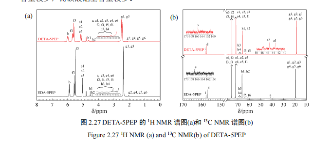从图 2.27 可知,DETA-5PEP 1H NMR 和 13C NMR 谱图与 EDA-5PEP 类似。图 2.27 (a)显示,两种聚碳酸醚酯在 1-2.5 ppm 范围内出现了-CH3氢质子峰(g1-g6)。其中,与碳酸酯基相邻的-CH3(g1,g3)氢质子峰强度显著高于与醚基相邻的-CH3(g2,g4, g5,g6)氢质子峰。DETA-5PEP 在 5.98 ppm 处出现了-CONH-氢质子峰;在 5.53-5.77 ppm 范围内出现了与碳酸酯基相连的-CH-(f1,f3)氢质子峰;在 5.14 ppm 处出现了碳酸丙 烯酯开环后与碳酸酯基相连的-CH2-(e1,e2,e5)氢质子峰。此外,DETA-5PEP 在 4.63 ppm 处出现了与碳酸酯基相连且另一端与碳酸酯基相邻的碳酸乙烯酯开环后的-CH2- (h1);在 4.42 ppm 处出现了与碳酸酯基相连但另一端与醚基、羟基相邻的碳酸乙烯 酯开环后的-CH2-(h2)。2.6-4.0 ppm 范围内的信号为与醚基、羟基相连的-CH-和-CH2- 氢质子峰。结合图 2.25(a)可知,该范围的氢质子峰较弱,这表明分子中醚基和羟基 含量较少,而碳酸酯基含量较多。